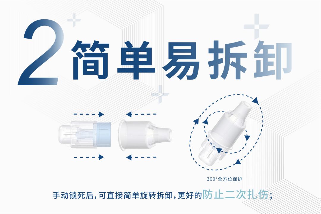 - 簡(jiǎn)單易拆卸:手動(dòng)鎖死后,可直接簡(jiǎn)單旋轉(zhuǎn)拆卸,有效防止二次扎傷。